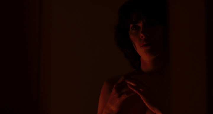 When the alien regards “her” reflection, “she” is just starting to have an awareness of “her” body and an interest in its capabilities. The editing becomes fragmented as it cuts to close-ups of various body parts half-concealed by shadows. It’s appropriate that “her” genitals are obscured, since they remain a mystery to “her,” especially once “she” attempts to have sex in a later scene. The alien’s movements in front of the mirror suggest that it is finally becoming accustomed to its place within the façade of another species, yet when it tries to have sex, it comes to the bewildering realization that its reproductive organs are, alas, only skin deep. To become human is to become vulnerable, and the alien’s emotional awakening is fraught with danger. The tender moments it shares with a disfigured man are entirely genuine, and lead the creature to rebel against its designated purpose. Yet the only fate awaiting this hopelessly lost being is a death as senseless as the ones it had caused while carrying out extraterrestrial orders.